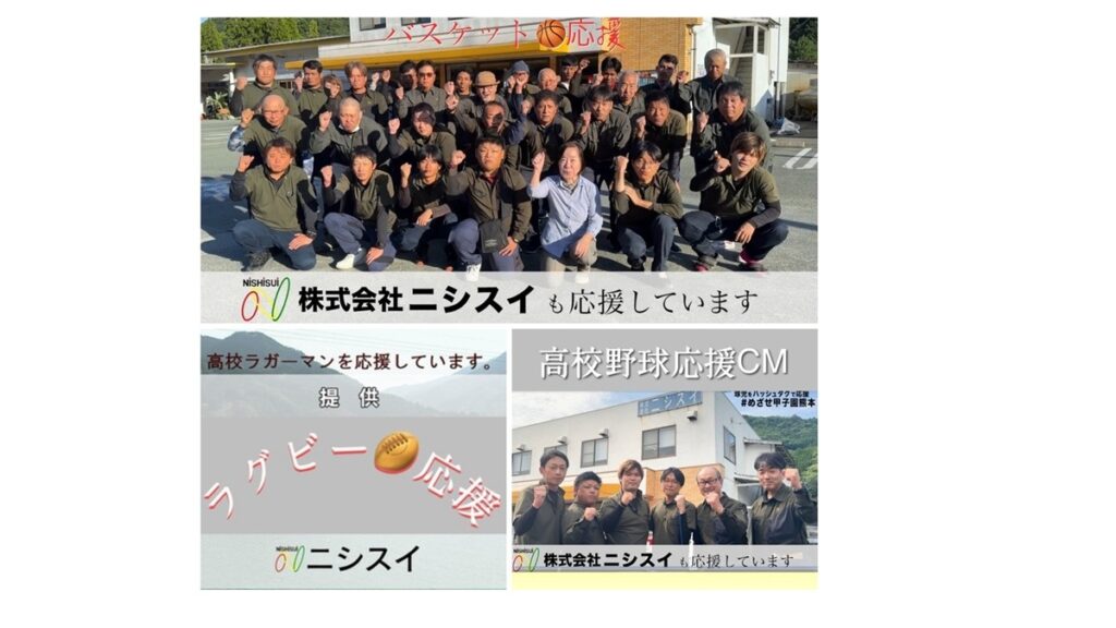 ニシスイでは高校生の一生懸命なプレーに感動と元気をもらっています。だから、応援したい! 夏の全国高校野球大会(KAB熊本朝日放送) RKKカップラグビー大会 (RKK熊本放送) ウィンターカップバスケット大会(KAB熊本朝日放送)でオンエアーされました。