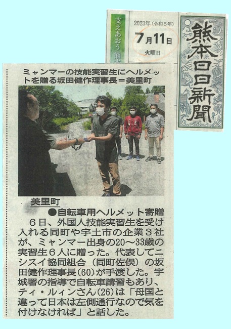 先日の宇城署による自転車安全講習に引き続き7月6日にニシスイ協同組合の坂田健作理事長から当社実習生に 自転車ヘルメットの手渡し式が行われました。